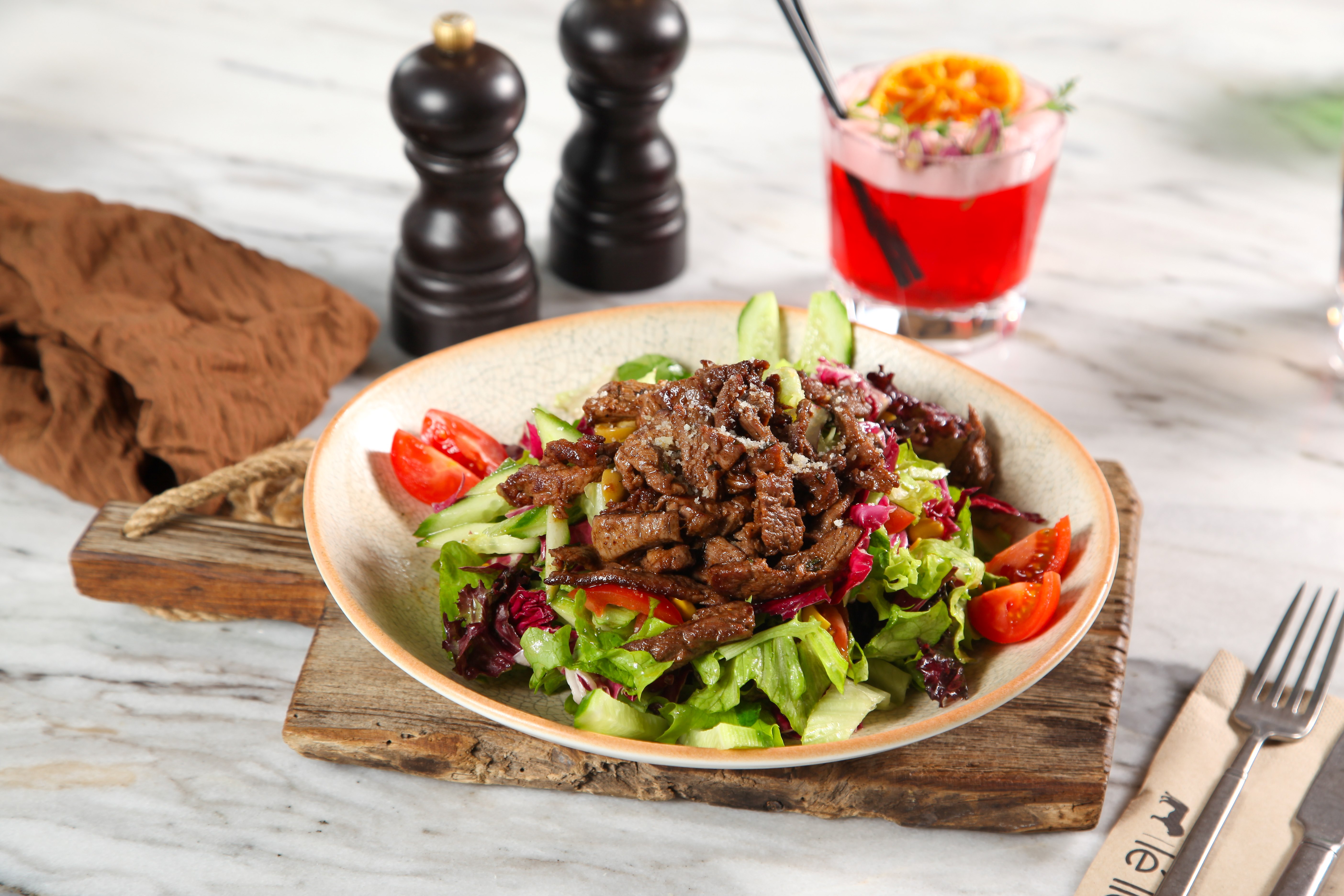 660,00domates mini mısır havuç salatalık taze soğan karışık yeşillik ve tiryaki soslu bonfile
