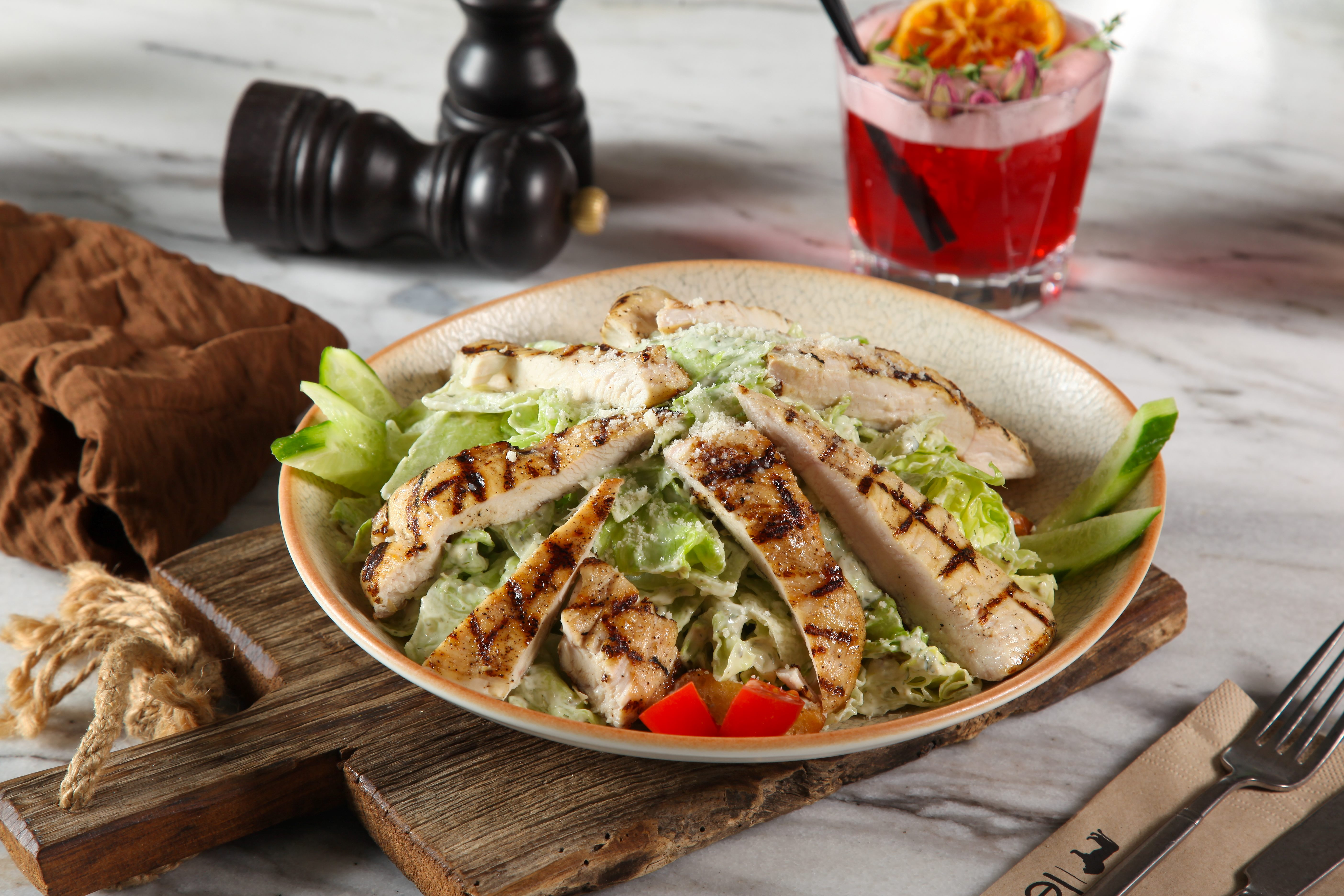 471,00taze marul yaprakları ızgara tavuk parçaları parmesan kruton ve sezar sos ile