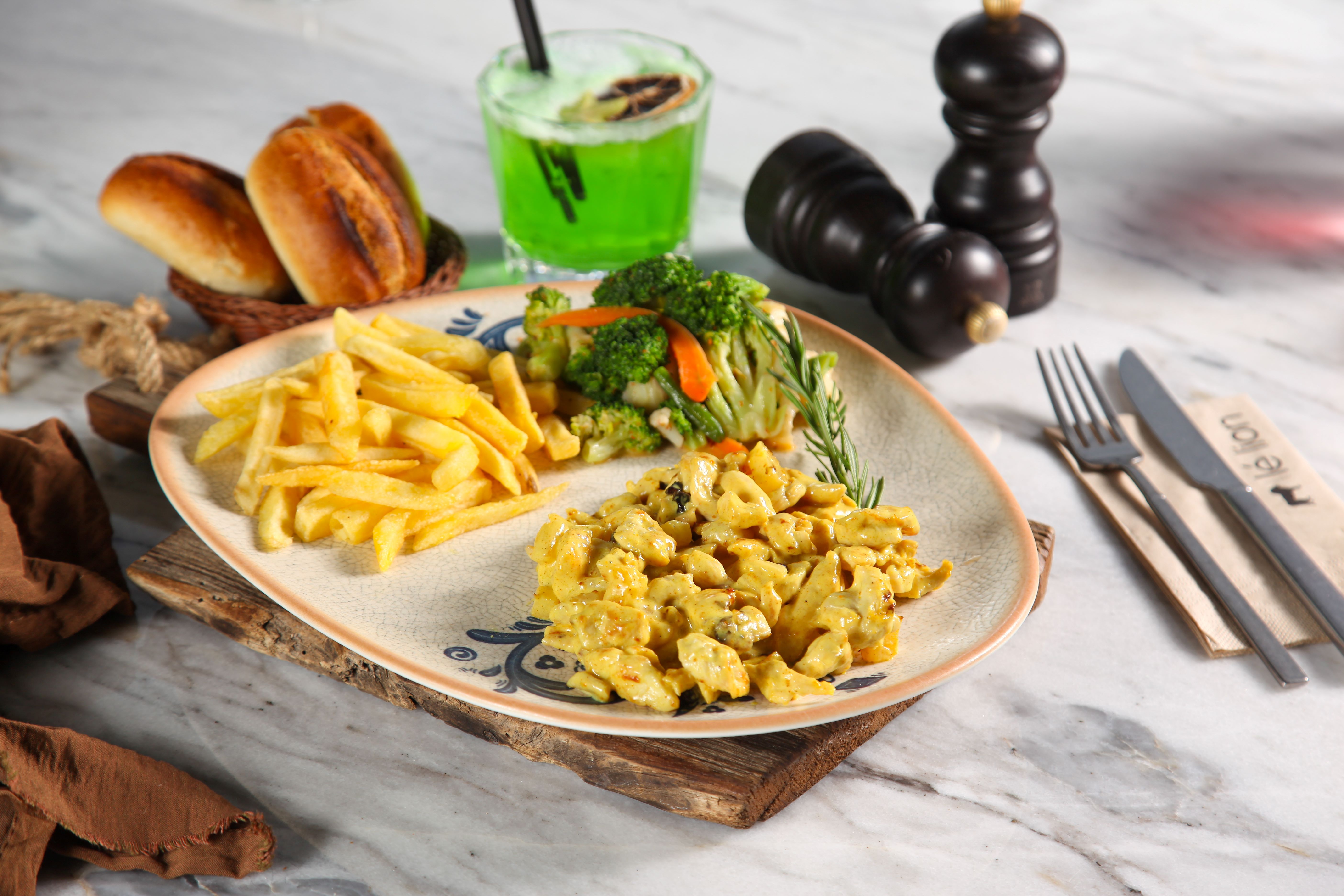 497,00170 gr tavuk parçaları mantar kapya biber yeşil biber köri soslu krema haşlanmış sebze patetes kızartması