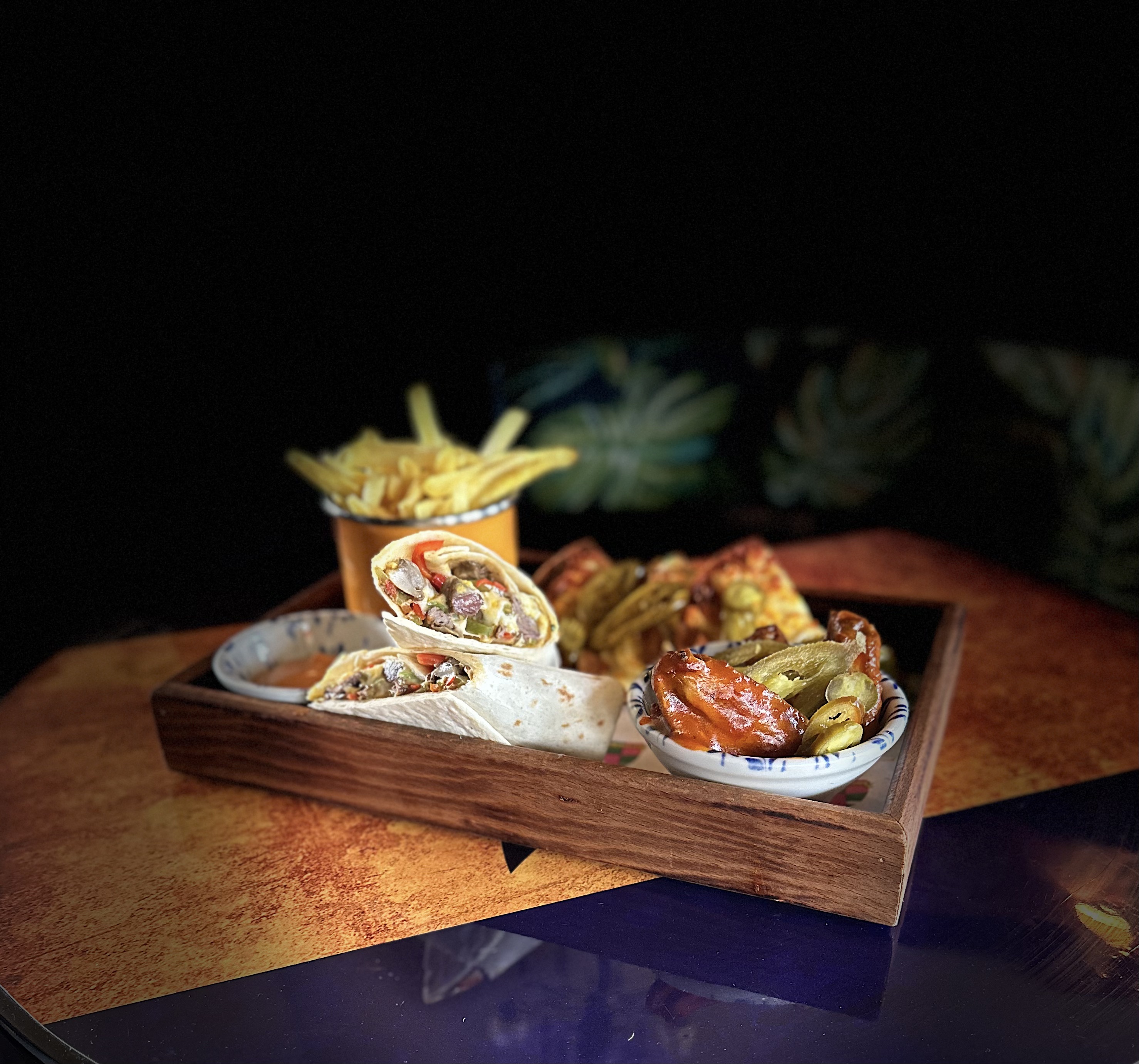 605,00Kajun baharatlı patates kızartması.Peynirli Nachos.Kızarmış biber.Buffalo kanatları ve et dürüm