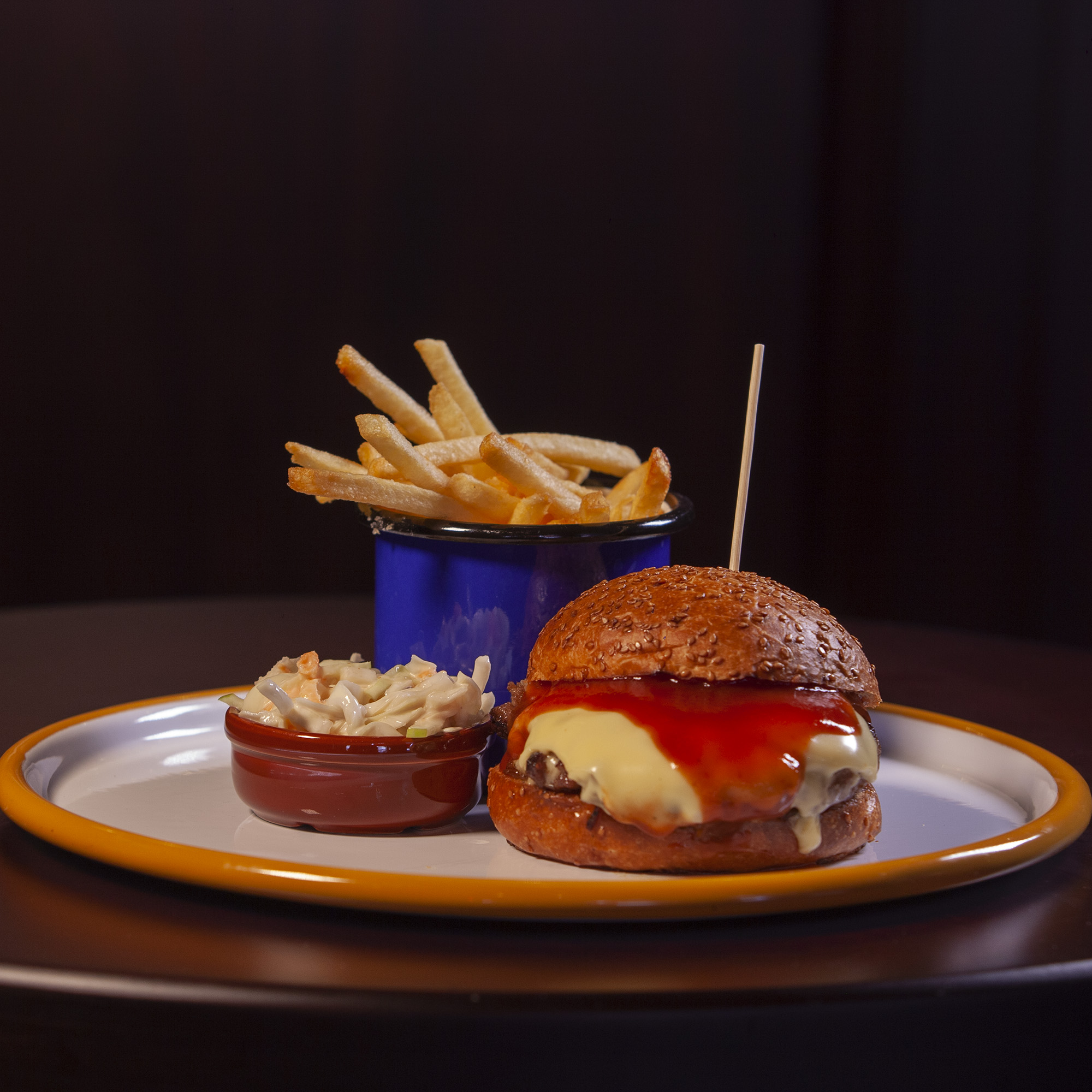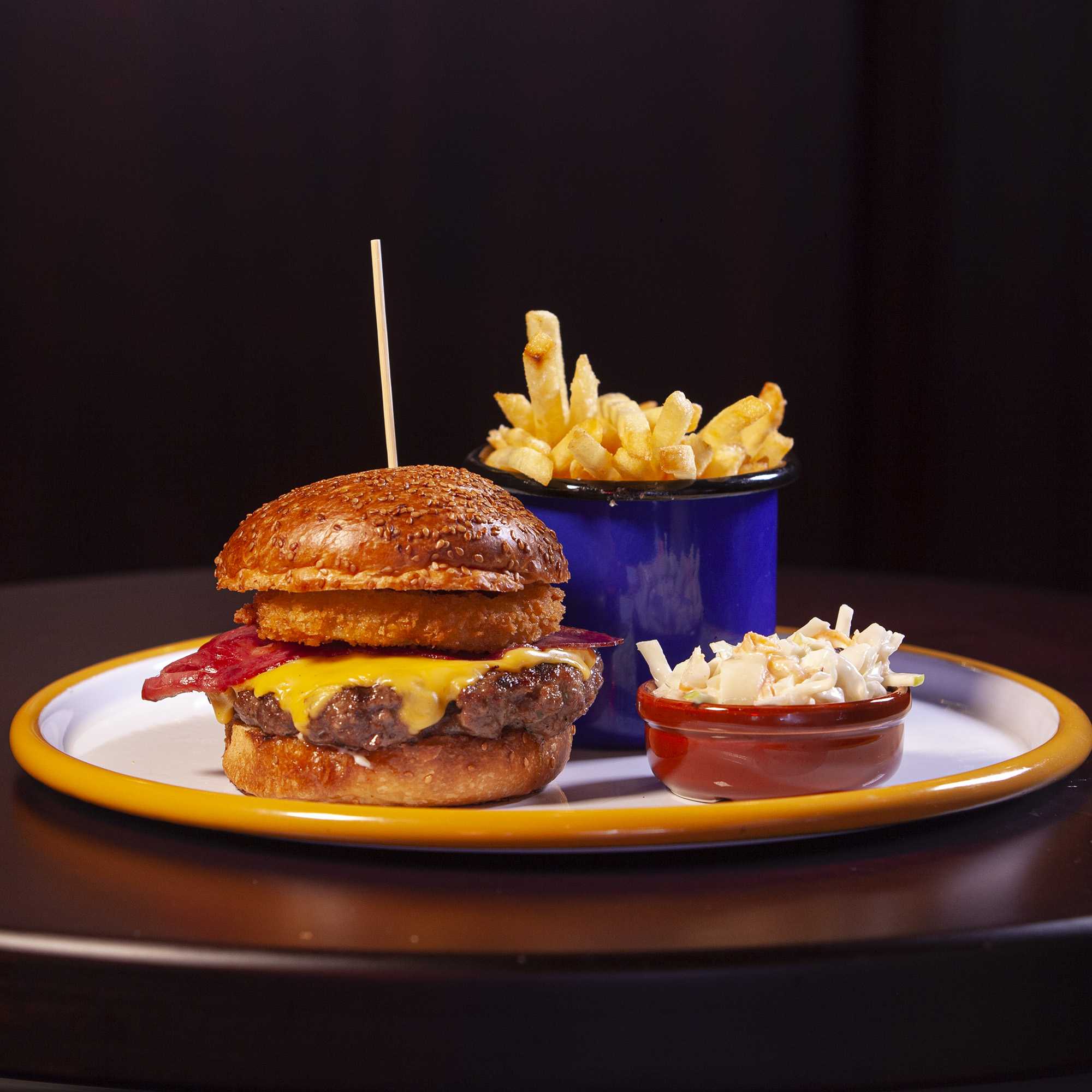415,00Karamelize soğan ve Barbekü soslu Cheeseburger, Kızarmış patates ile.