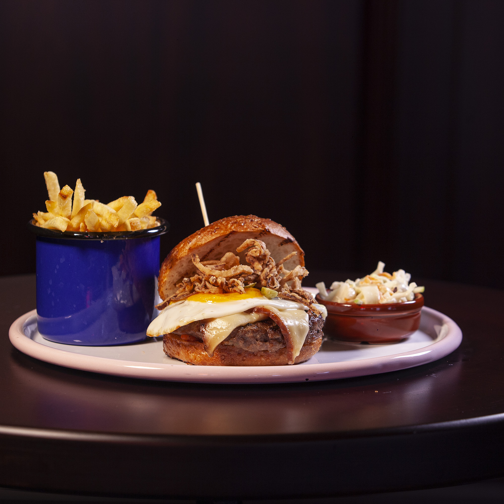 415,00İsli peynir, çıtır soğanlar, turşu, acılı salsa sos ve kızarmış göz yumurtalı burger.