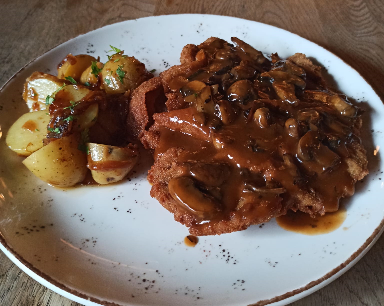605,00Et schnitzel, mantar ve gravy sos. Sotelenmiş baby patates ve karamelize soğan ile.